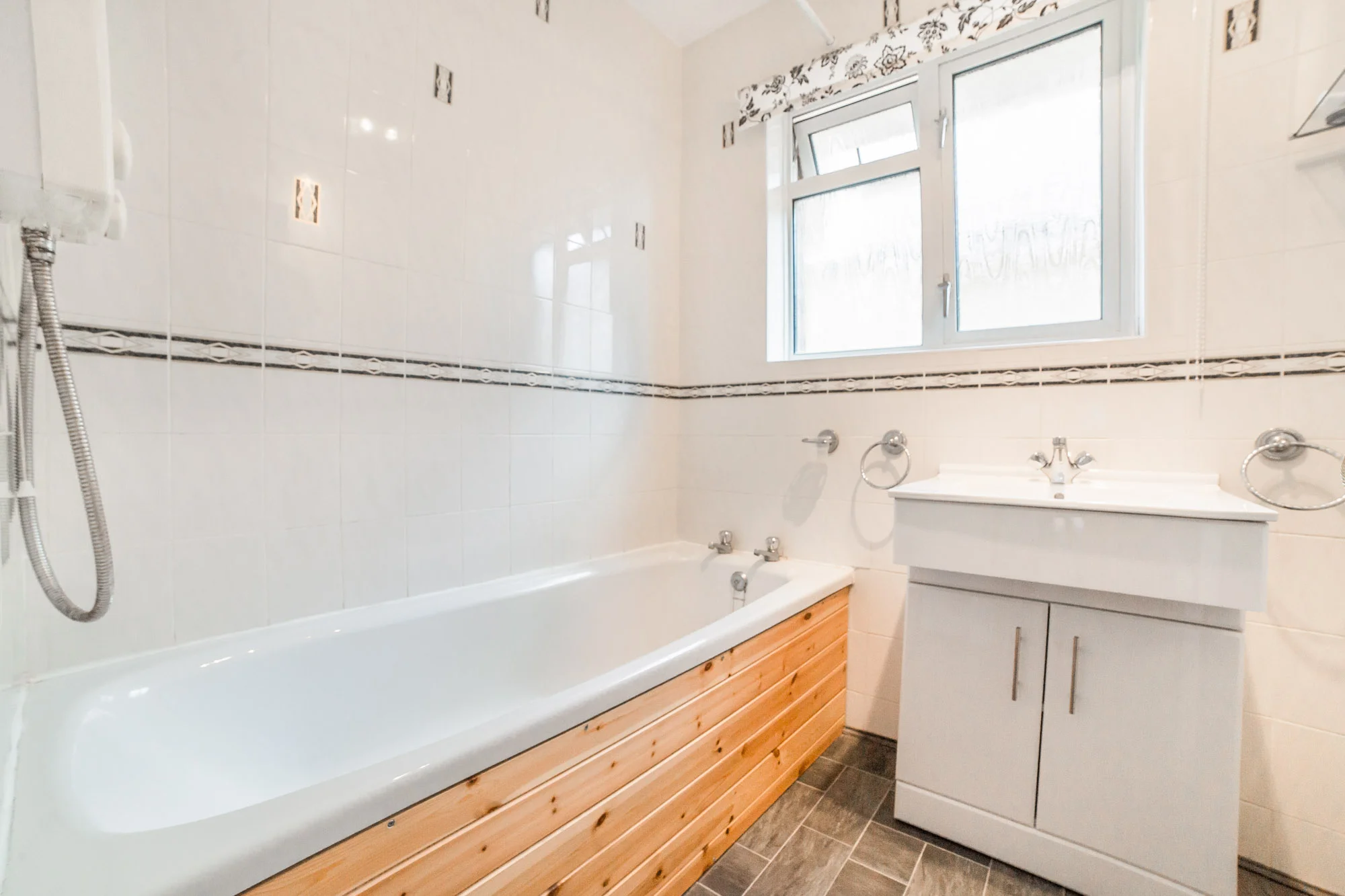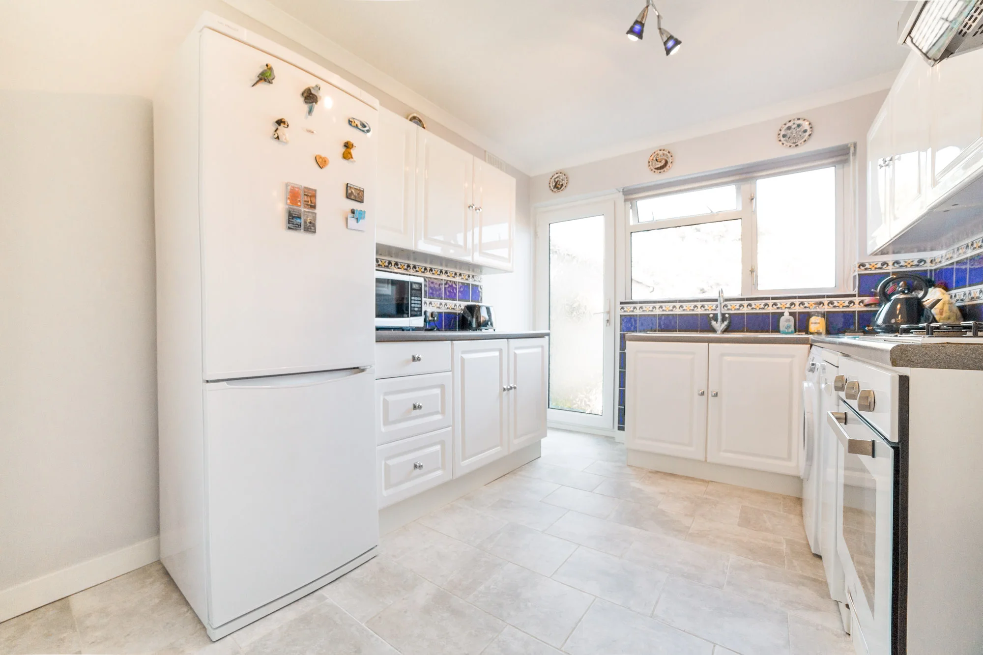 The modern fitted kitchen is adjacent, again a good size with a range of base fitted and wall mounted units down two sides with integrated oven and gas hob. There is space for a large freestanding fridge/freezer. A further door in the kitchen takes you out to the garden, ideal for popping back in to refill the guests glasses throughout the BBQ. At the back of the kitchen there is also a walk in pantry, so you will have plenty of storage space to store all your secret ingredients.