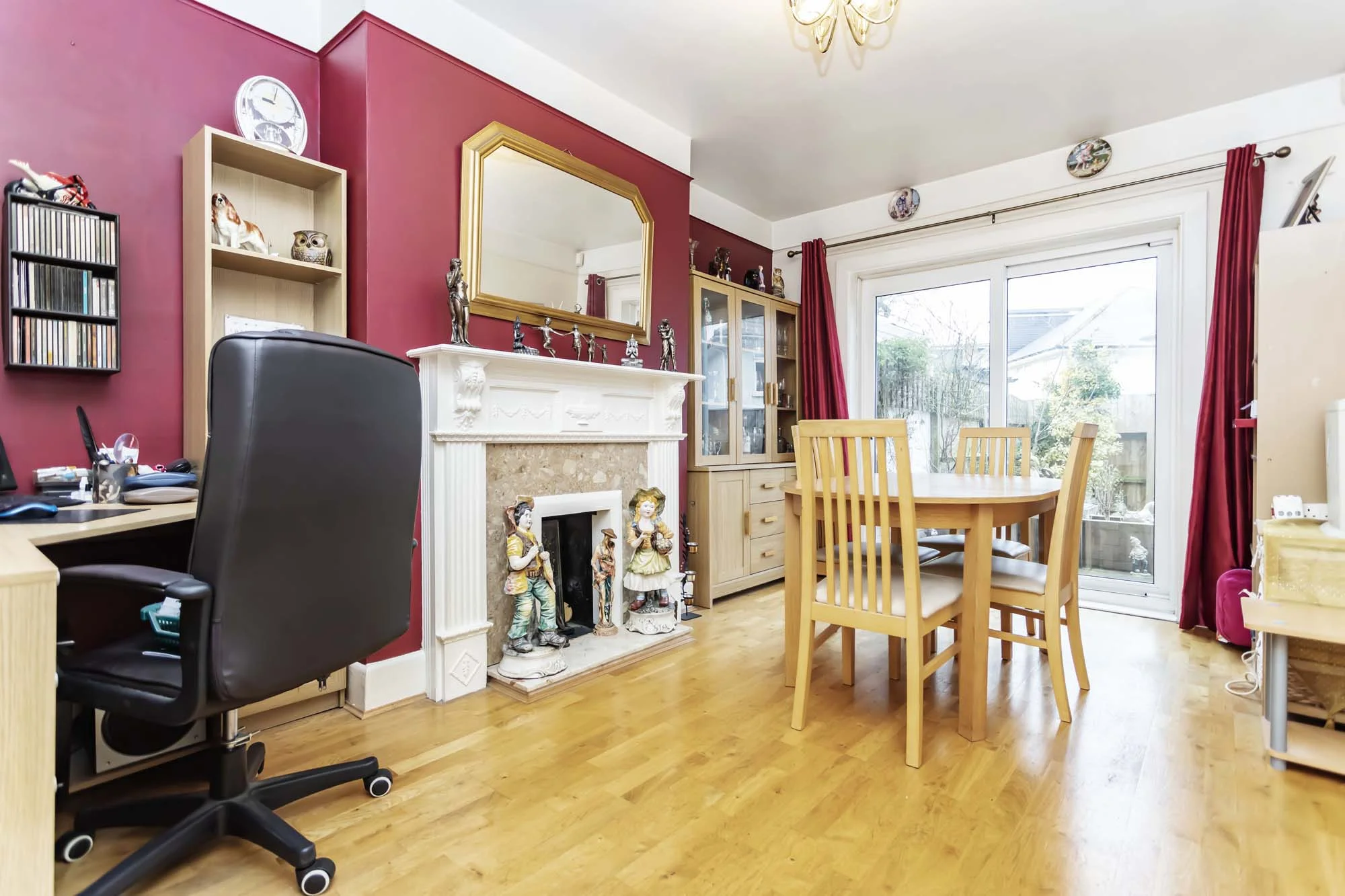 Moving towards the rear of the property is the dining room accessed via an alcove in the kitchen. The character features continue in this room which is generous sized and provides access to a raised patio area in the garden via double sliding doors. Real wood flooring covers the room and again there is a feature fireplace ideal for a log burner if desired, creating an ideal entertaining space for family and friends.