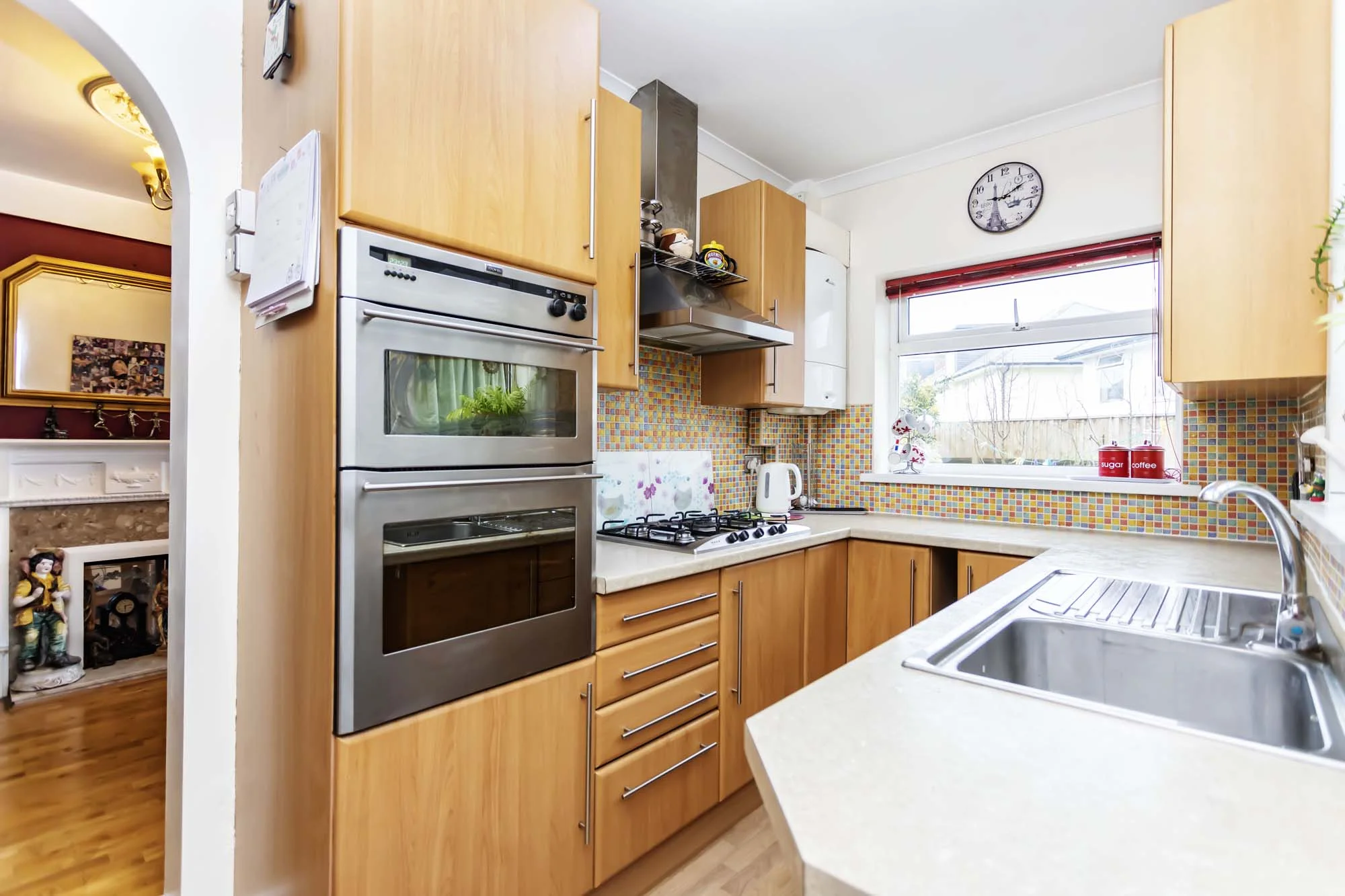 The kitchen is a traditional setup in a galley style, but within easy reach of the dining area. There is potential to remove a wall and create an open plan kitchen/diner across the rear of the property if preferred. The kitchen is well equipped with plenty of worktop space along with a selection of wood fronted base and eye-line units and centralised drawers. Integrated appliances include gas hob with built in fan assisted gas double oven with grill. The rear of the kitchen has a handy recess, ideal for additional appliances. The kitchen has double aspect with views out across the garden and the other into the utility area.
